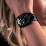 Gemstones glitter around the bezel and crown but don’t take away from its complexity or indeed, its technical brilliance. It’s very much in the URWERK mould as you can tell by looking at the watch. The revisions come in the shape of refinements including the satellite hours. The three satellites, each with four hour numerals, sweep along the minutes scale in an analogue and digital indication of time. The moon phase also adds to this display. The carrousel and satellites have been hand finished in satin and each numeral painted by hand. The extremely fine minutes scale was fashioned in the workshop with lapis lazuli blue of the moon being selected as the colour of choice. The miniaturisation of the various components is what really shines and makes this such a beautiful piece and great for daring women who would wear something so unique as a URWERK timepiece.
