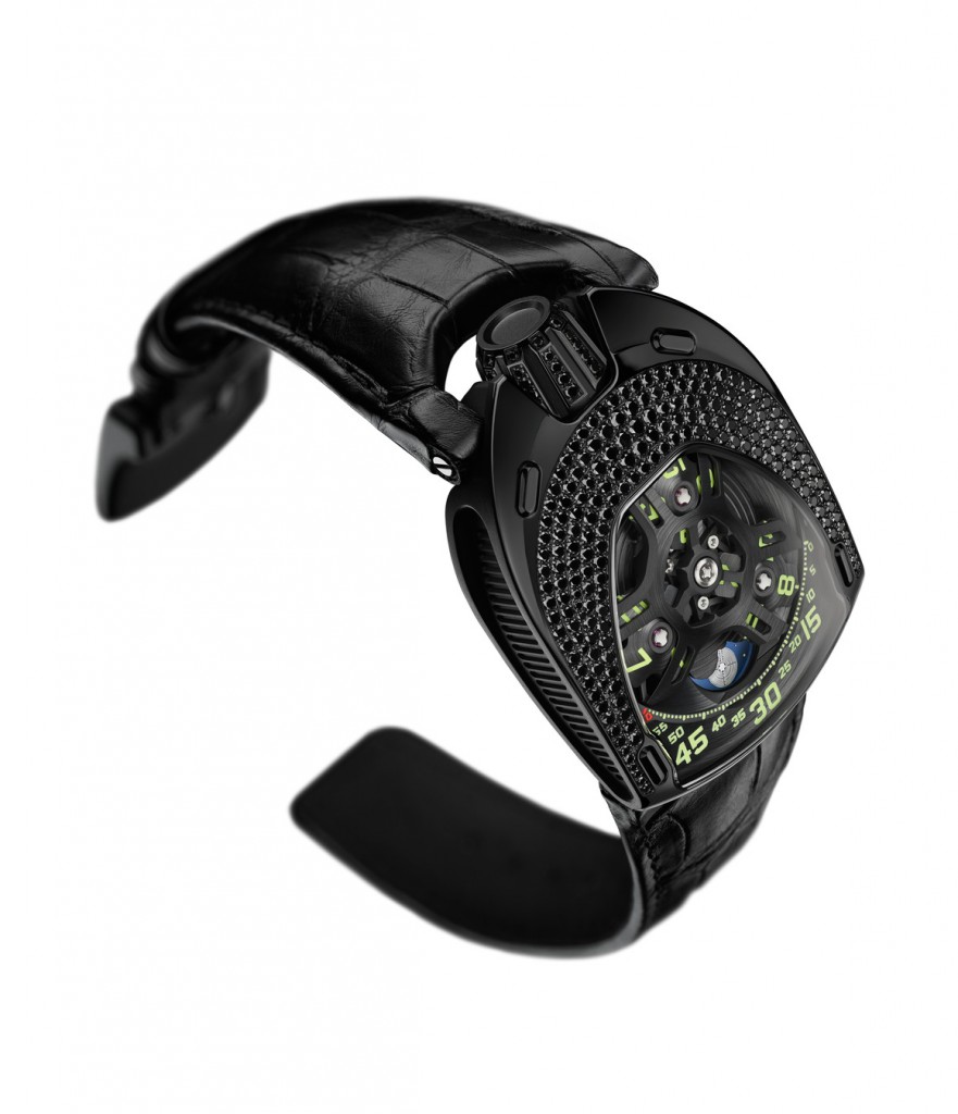 It comes in two versions: one in titanium and steel with diamonds on the bezel, crown and buckle; its antithesis is the black PVC-coated titanium and steel set with black diamonds. Beautiful and executed to perfection, it’s definitely clear to see why it has taken URWERK 18 years to perfect everything from case to right down to the movement and even something as small as choice of colour for the minutes slider.