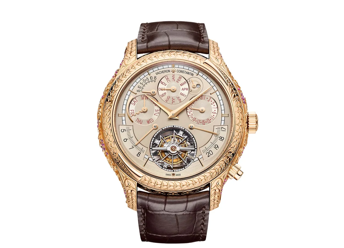 The new watch takes inspiration from the Roman god Bacchus who was the god of vines and wine. Presumably then, this watch will be sold as the Vacheron Constantin Les Cabinotiers Grande Complication Bacchus everywhere except Greece where Bacchus will be replaced by Dionysus, who knows. What we do know is that there’s no surface of this watch that has not got texture to it. The main attraction is the solid 18k pink gold case which, let’s not mess around here, blows that reversing watch from Patek Philippe into the weeds. The sides of the case feature an attractive grapevine motif with rubies expertly set to represent the grape bunches on the vines. There’s also engravings of vines between the lugs, on the lugs and around the bezel. While the engravings on the side of the watch will doubtlessly draw the most attention, the engravings on the bezel and lugs actually represented the largest challenge. As the vines take up the entire width of the bezel, there are no guidelines to help the engraver, one small slip up and they’re re-doing the entire thing. This vine garland motif is also carried onto the folding clasp or pin buckle, presumably these are both included.