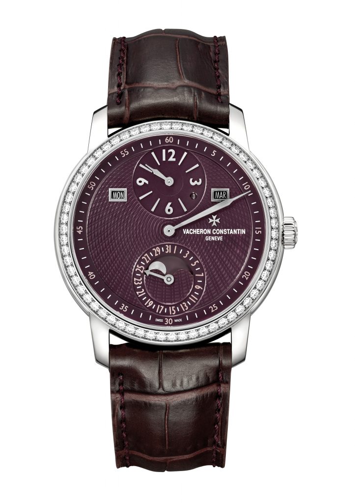 The regulator is perhaps one of the more unusual forms of displaying the time, but that’s an old saying that I’ve used countless times before. Regulator clocks were used as the primary timekeepers in the 17th and 18th century, in fact, right up until the digital age took over. They were highly accurate, as they set the reference time, the minutes taking priority and therefore having the entirety of the main dial to themselves. The plum-coloured guillocheé dial on this watch is no different, though it has a few peculiarities. I like the hours subdial, with the Arabic numerals that are oriented towards the centre, except for 6 o’clock for obvious reasons. This watch hides most of the complexity of the 2460 RQP’s perpetual calendar very well, and the 62 brilliant-cut diamonds are sure to distract even further. An odd choice of colours, in my opinion, but balanced very well here.