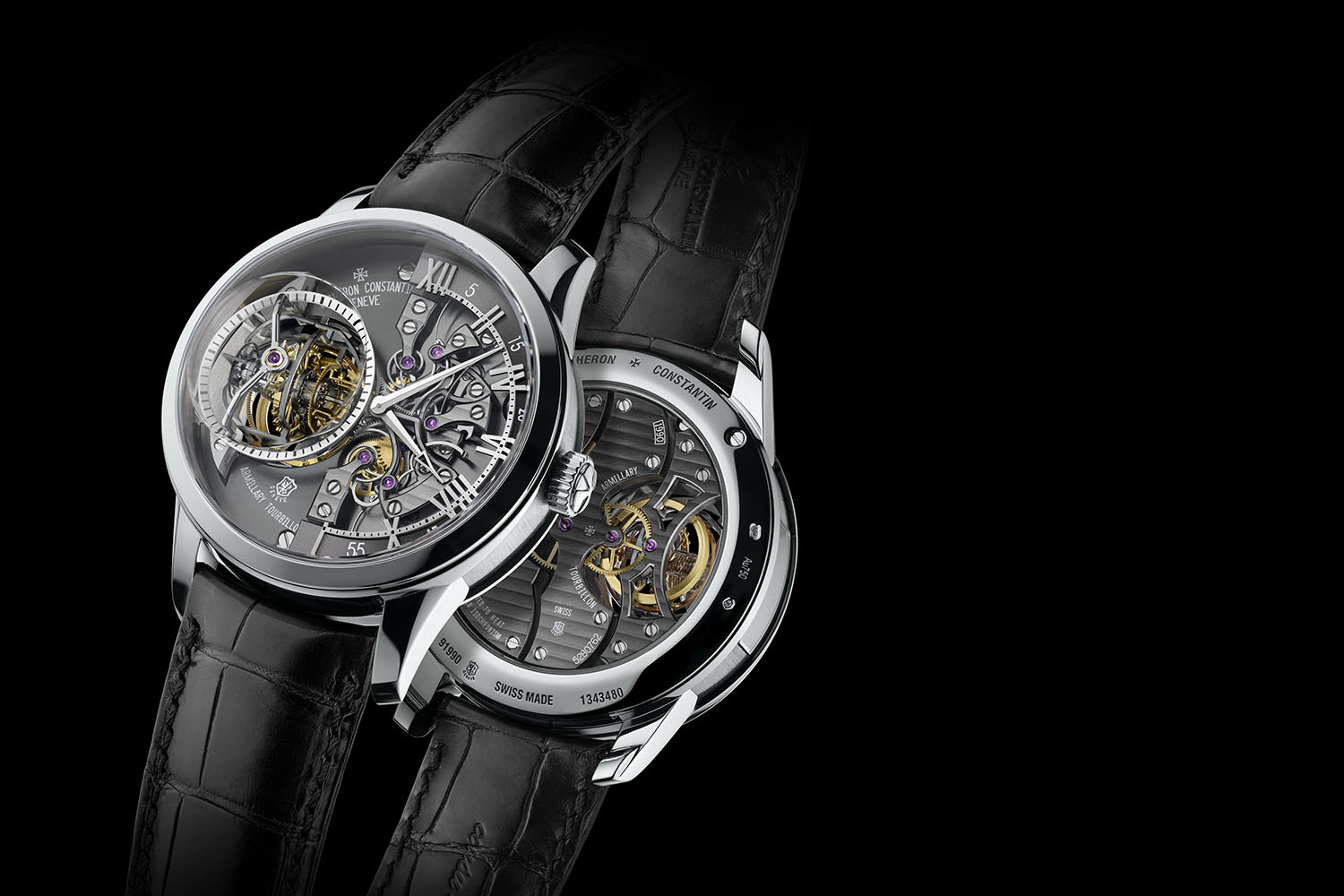 The Vacheron Constantin Maitre Cabinotier Retrograde Armillary Tourbillon is made out of 18k white gold. A large watch, it measures 45.7 mm in diameter with a thickness of 20.6 mm (including the Cyclops eye over the tourbillon). A tall watch due to the space needed to house the tourbillion system. Water rating is 3 ATM.