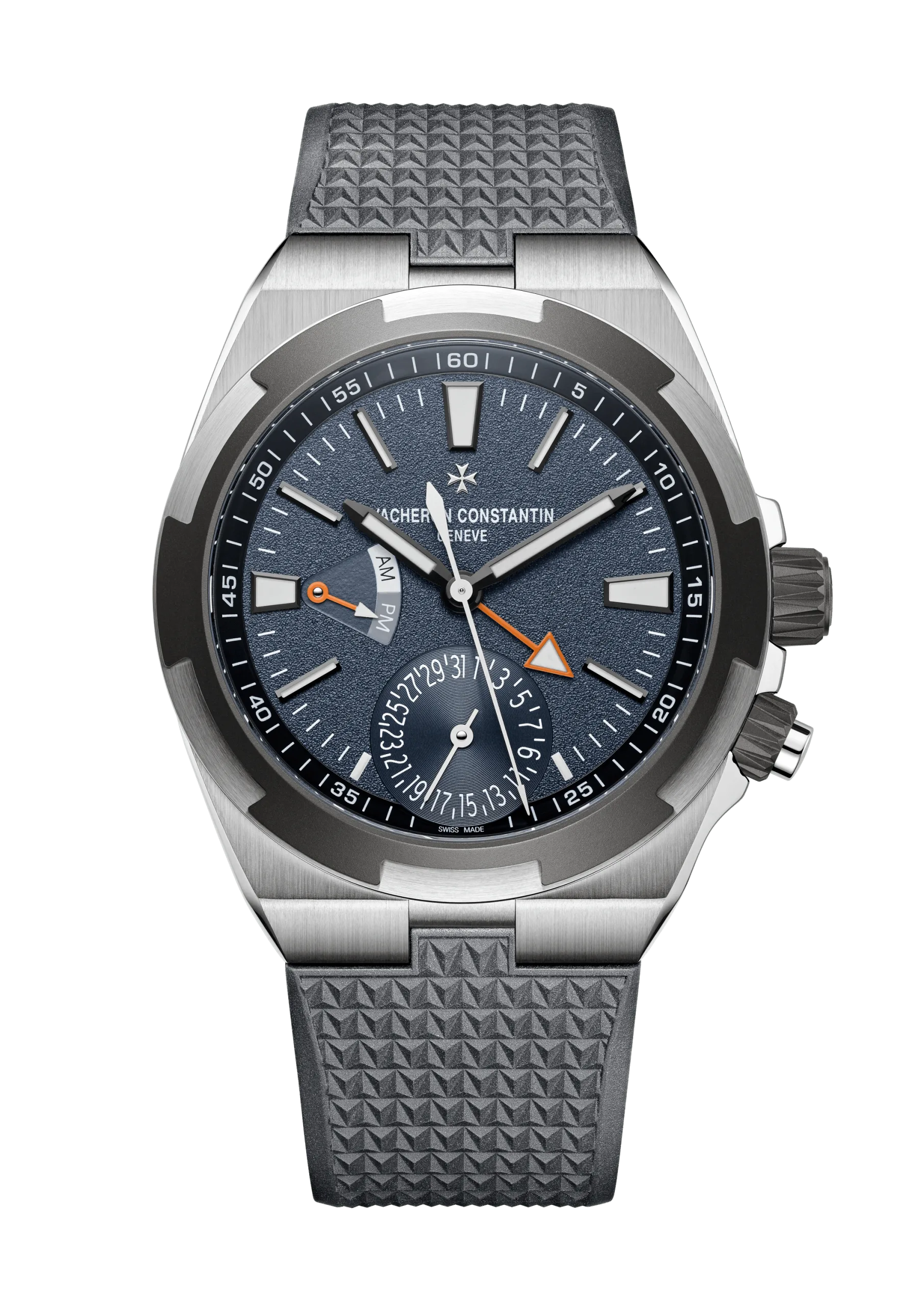 To complement the Titanium construction, Vacheron has equipped these watches with dials that feature a nice textured finish. Furthermore, the greyish blue color scheme adds to the rugged and sporty character of these watches. To make the dials colorful and lively the dials have been sprinkled with vivid orange accents. The layout is identical to other corresponding members from the Vacheron family. The chronograph model comes with a tri-register setup, a date window between 4 and 5, applied lume filled hands and markers, and a double-minute chapter ring. The GMT, on the other hand, features an AM/PM indicator, a circular date display, a triangle-tipped GMT hand, sharing the rest of the details with its chronograph sibling.