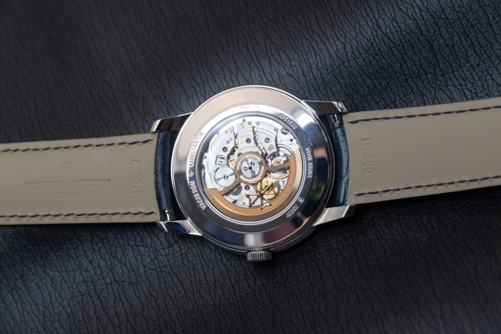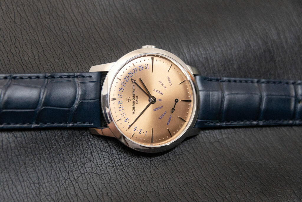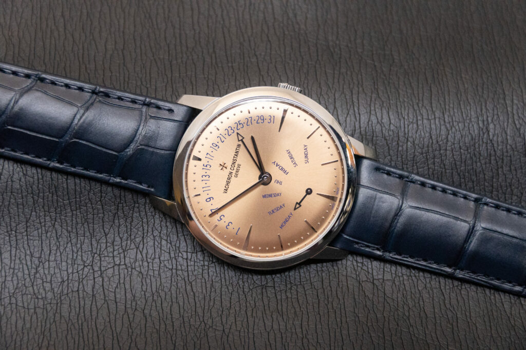Vacheron Constantin is very proud of the Patrimony range being their classiest, most formal dress watch. They have said they refuse to put big, chunky complications in it, as it’s meant to be a sleek watch that easily slides under the cuff of even the most form-hugging shirt. So, no chronographs or tourbillons here, but the minute repeater can be spaced out enough to fit into the super-thin Patrimony lineup. This watch, while lacking a chime, has charm instead.