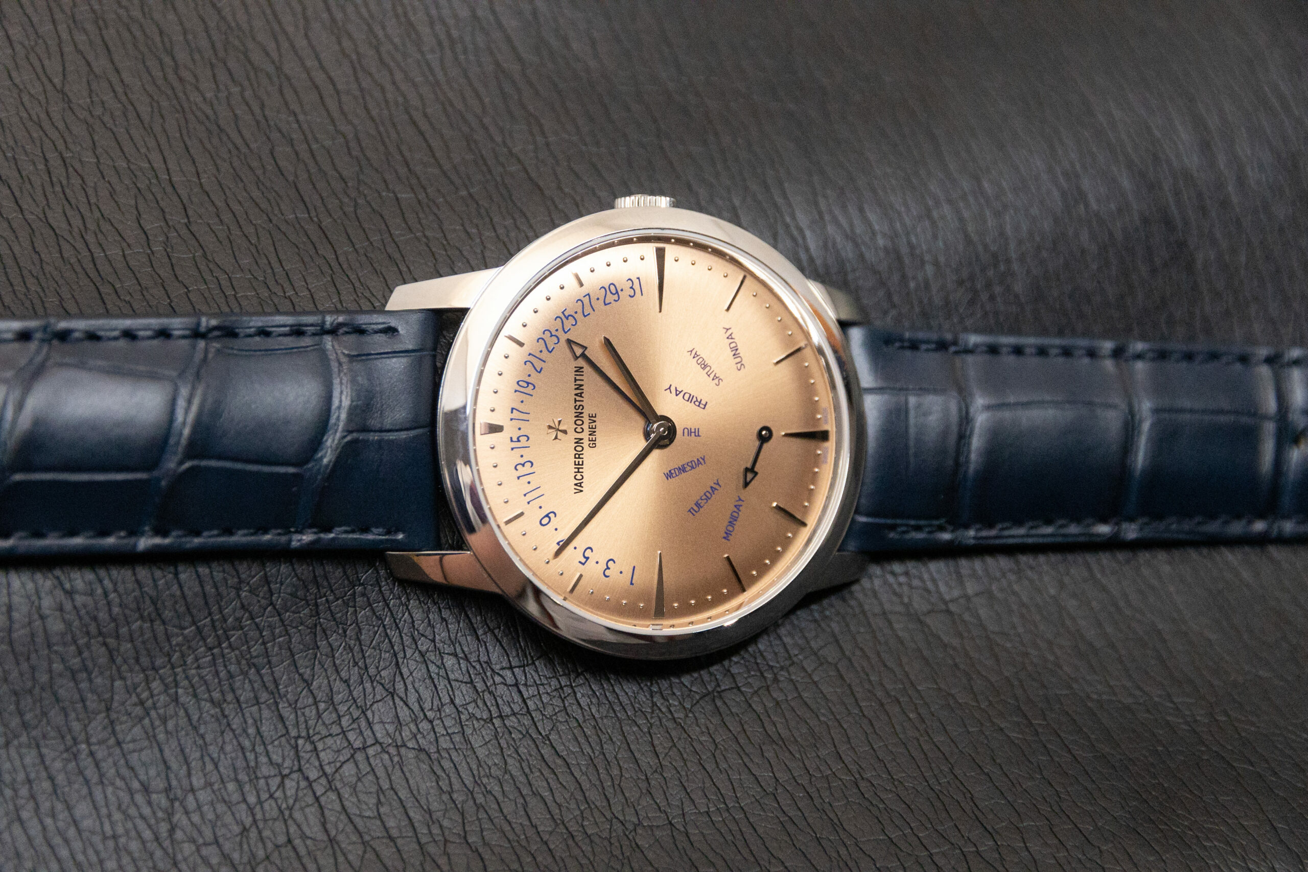 The 42.5mm platinum case is surprisingly heavy at 127 grams, but it’s only 9.7mm thick, so it still works just fine as a dress watch. The salmon-coloured dial with its sunburst finish, works beautifully under the light and contrasts with the blue appliqués used around the place. Specifically, the retrograde hands, which fly back to the beginning once they reach the end of their arc, and the text they point to are all in blue, which matches the supple calfskin and alligator leather strap.