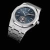 This new creation was actually unveiled to us in its original form last year at SIHH and is a slim and almost chic travel time watch. The home hours are shown as a number in a window where 11 O’clock would be and the away time in a similar aperture located where 5 O’clock would normally be. There is also a single thin, silvered hand protruding from the centre of the decorated dial which points to a retrograde minutes indicator spread across one part of the outer dial ring, diagonally opposite to the words Heure d’ici & Heure d’ailleurs (Time here and Time there). All three of these functions are set and adjusted through the single crown on the right which means that there aren’t any pushers to clutter up the case.