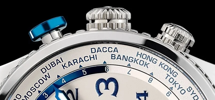 Powering the Vulcain Aviator Cricket is the Calibre Vulcain Cricket manufacture V-11 movement which operates at 18,000vph and has a power reserve of 42 hours. It has a date indicator (visible through a 3-day window at the 6’oclock mark) as well as its signature alarm function equipped with the ‘Exactomatic’ system which rings for a whole 20 seconds when activated.