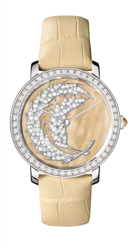 On the watch face, simplicity is overtaken by the elaborate craftsmanship of the brand. There are no hour markers here but a beautiful picture. Of course a die hard minimalist will love the dial with a very strong emphasis on aesthetics. The Métier d’art dial shows two wheat ears in white gold sculpted and engraved in volume over the mother-of-pearl. The grains are arranged in clockwise direction on the left side and are at different levels of height to have a 3D feel. They are also paved with snow-setting diamonds.