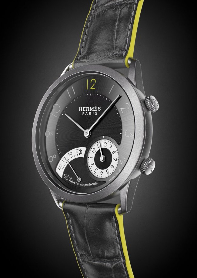 The Hermes Slim d’Hermes L’Heure Impatiente is part of Hermes’ Poetic complications collection. Whilst the alarm function is a crucial part of the watch, it’s that finger-tapping against the table feeling of anticipation before an event that Hermes wants to focus on with their alarm/countdown complication.
