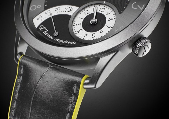 Not only is the watch a unique twist on the alarm complication, but it is a truly beautiful watch. The regular production Slim d’Hermes L’Heuere Impatiente is made of rose gold but for Only Watch, Hermes changed the case material to Grade 2 Titanium. This gives the watch a contemporary look that the soft hues of rose gold cannot match. The numbers on the dial were designed by award winning graphic designer, Philippe Apeloig.