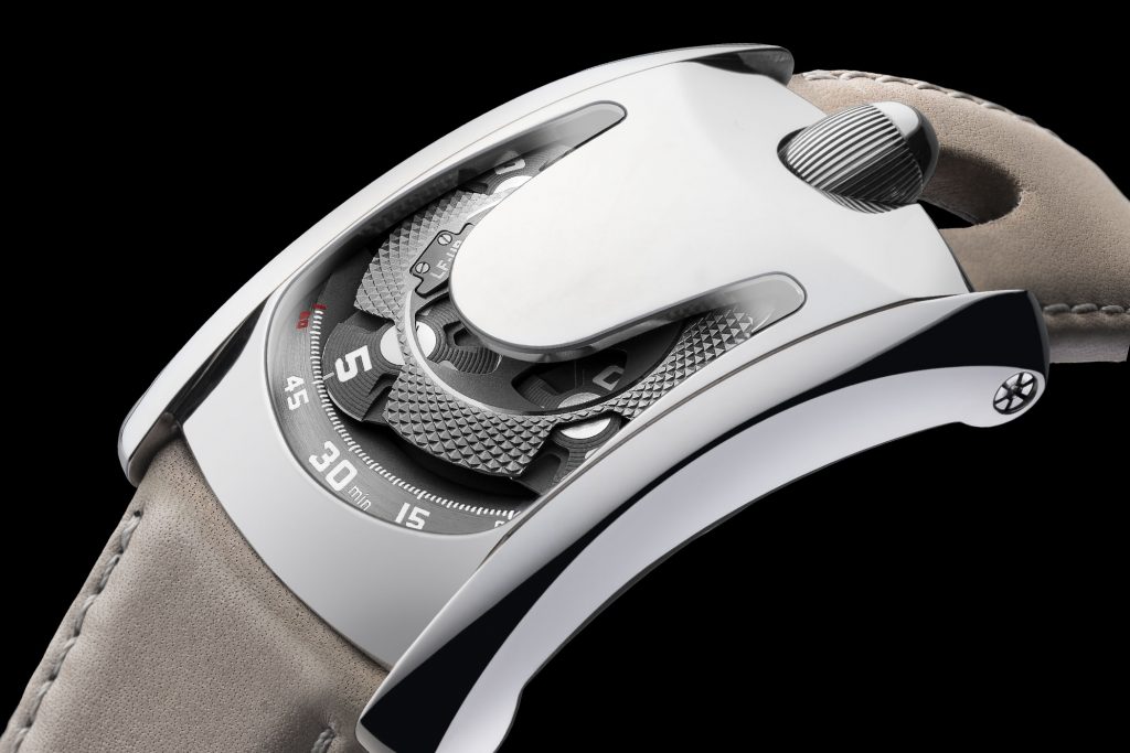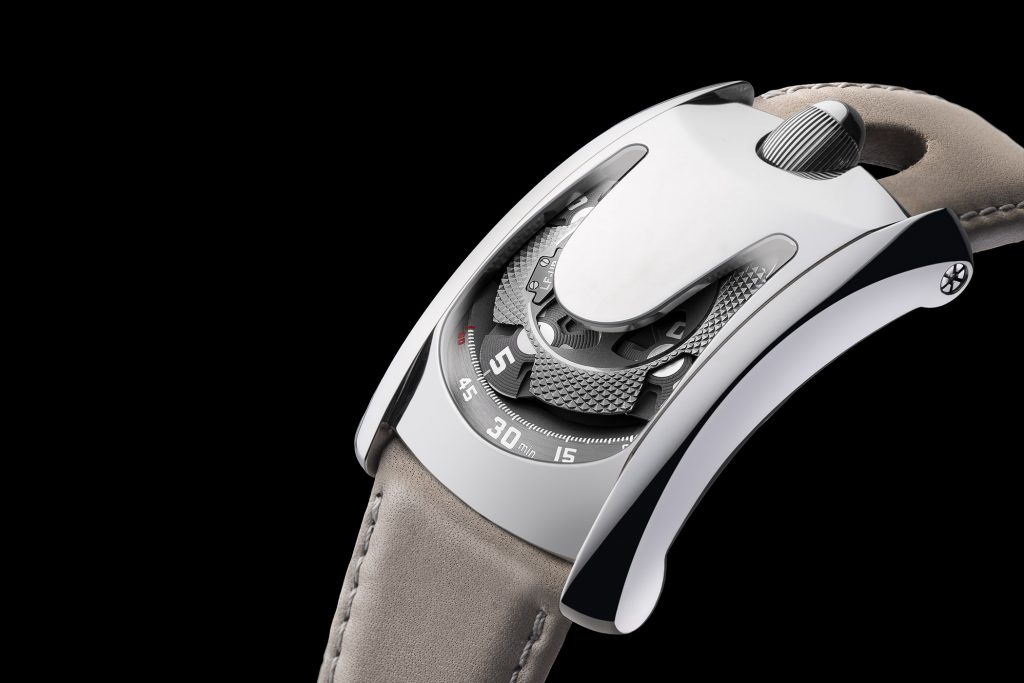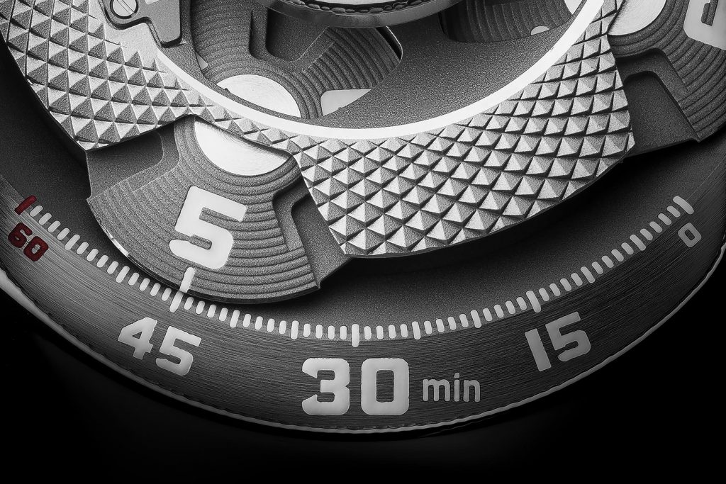 When it comes to the movement, it’s still Urwerk, textured, sharp and modern. The Arpal One watch employs the wandering hours and satellite complication seen in the UR–105. Time is presented by four satellites, each bearing three hour numerals that successively sweep past the track of minutes located at the lower side of the front face. The movement sports automatic winding complete with the double turbine that governs the winding. This tech is seen at the back of the watch. The self-winding UR5.03 gives the Arpal One a solid 48 hours of power reserve.