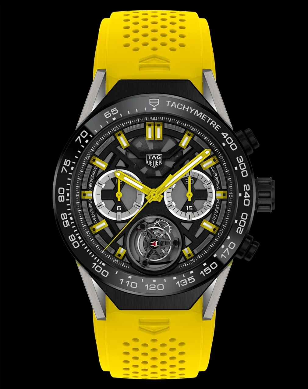 The Connected Modular 45 is powered by an Intel® Atom™ processor Z34XX series running Android WearTM 2.0 while the Heuer 02-T Module runs on in-house Calibre HEUER–02T. The COSC-certified Tourbillon can be seen through the skeletonized dial particularly the column wheel and the titanium tourbillon cage. It also cranks out over 65 hours of power reserve. Both modules wear on either black or yellow perforated rubber strap with removable titanium Grade 2 folding clasp and safety push-buttons with satin finish.