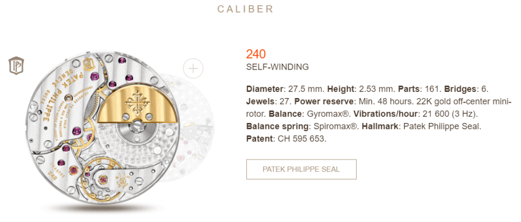 The calibre 240 Q features a an off-centre micro-rotor done in 22 ct. gold that’s recessed into the main plate, thus reducing the height of the calibre quite a bit – at least compared to the majority movements with a central rotor. A simple calibre 240 only measures 2.4 mm which is 0.9 mm less than calibre 26-330 S C. The micro rotor doesn’t only reduce the height of the calibre but it also offer an unimpeded view of the calibre at all times. The calibre 240 is – in all of its different guises – a sight for sore eyes due to its superb finishing. The finishing consists of perlage (i.e. a pattern of interlacing circles) on the barrel bridge, wave-like Geneva stripes on the gear train bridge and micro rotor, chamfered and polished edges on its eight bridges, polished sinkholes for the black polished screw heads, engraved Calatrava cross on the micro-rotor and much more attention to detail which I won’t dwell into any further in this article due to character limitations.