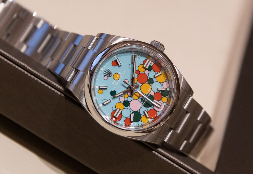 For its Oyster Perpetual line, Rolex revealed the “Celebration” dial decoration, which sports vibrant bubbles. Although the Oyster Perpetual’s “Celebration” dial received polarizing initial reception, its cheery bubbles symbolize happiness, vivacity, and good times, making it a very uplifting dial. The Celebration motif, which features the 2020-introduced lacquered dials, is available for Oyster Perpetual 31, 36, and 41 watches. The watches have movements Calibres 2232 and 3230 and have Superlative Chronometer certification.