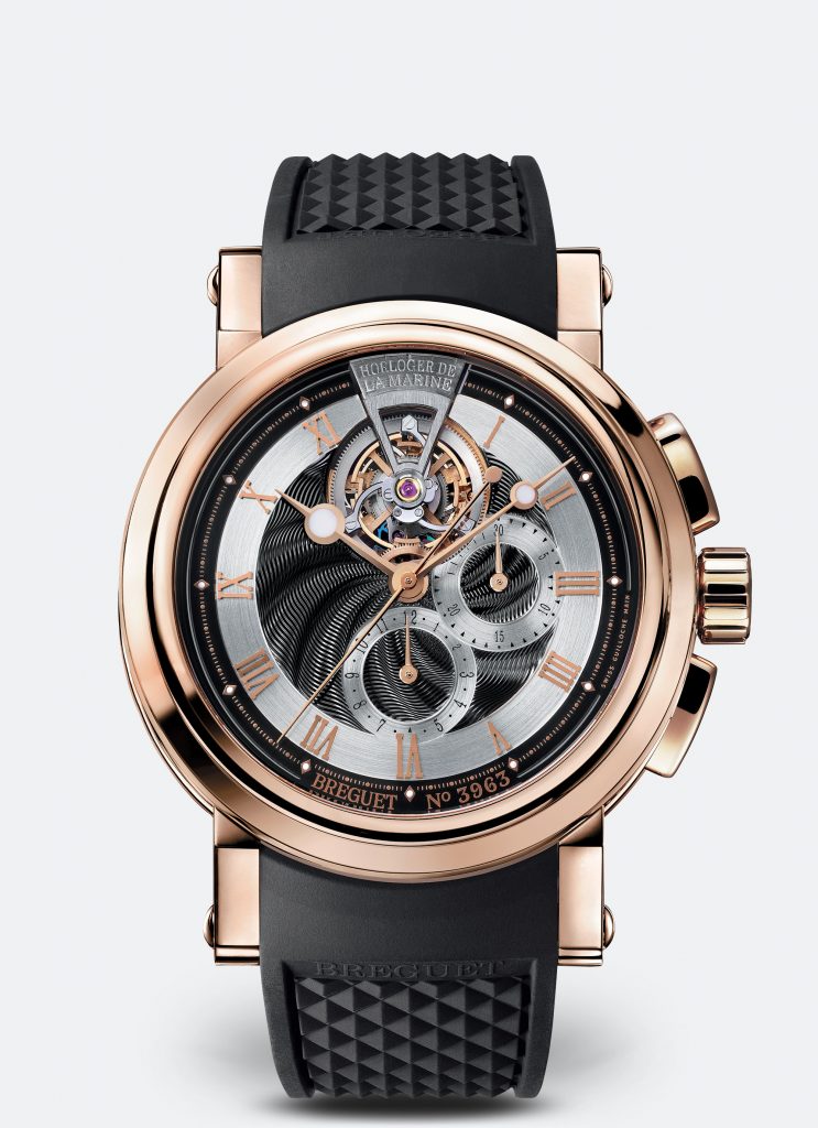 For this one, Breguet goes one step further and offers what it calls a ‘Grande Complication’ in this watch. Not only does it feature a tourbillon, but there is also a chronograph operated by the pushers which are cleverly disguised as crown guards. Although it’s quite a traditional watch, that hasn’t stopped Breguet from making the tourbillon carriage out of titanium, which is extremely hard to machine if you were wondering. Although it is a very cool watch, its looks are, shall we say, polarising. To paraphrase the Watch Snob, the more complications Breguet adds to the Marine collection, the uglier it gets. Very cool rubber strap though.