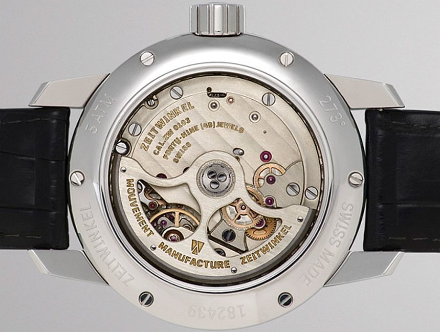 Turning the 42.5mm polished stainless steel case over you are greeted by the stunning ZW0103 manufactured movement with featuring german silver plates being shown off once again through a sapphire case back but this time clear to give an excellent view of its beating heart. The case was designed in unison with the movement so no spacers or gaps are present, just a perfect fit much like a well tailored suit. All the plates and bridges of the mechanism, as well as the semi-integrated complication, are made of German silver, chamfered and hand-decorated. German silver is noticeably harder than the brass that is usually used and requires the greatest precision in its manufacture and engraving. Not too much of the movement is on show but the parts that are include rotor, balance wheel and a few parts of the gear train which in my opinion put more emphasis on the beautiful silver plates that Zeitwinkel want to show off.