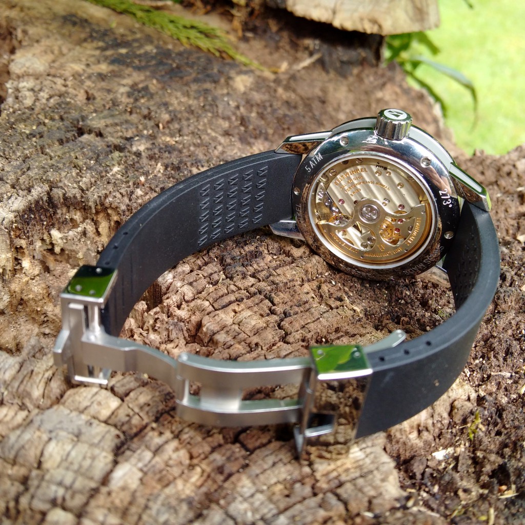 Finishing off this piece as an alternative to their leather strap, a high-quality and durable caoutchouc rubber strap with a stainless steel folding clasp designed to be secure but also able to be closed and opened one-handed is provided.