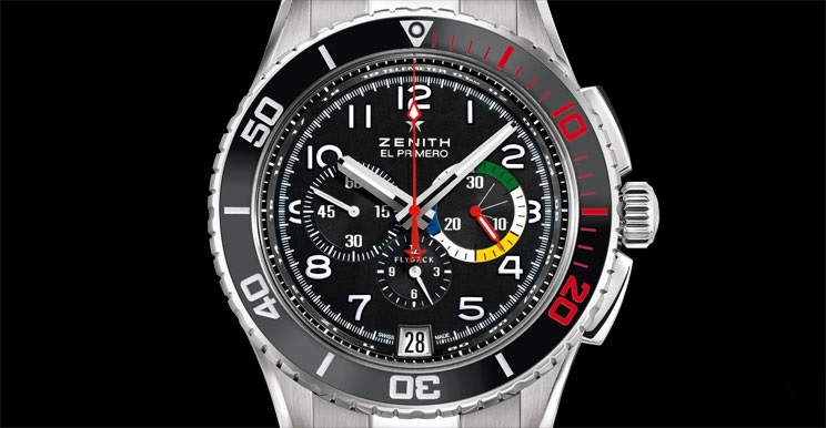 The latest evolution of the El Primero since it was first launch back in 1969 is the Stratos Flyback Rainbow. This watch is a revision of the Rainbow Flyback model of 1997. Designed based on a French Ministry of Defense requirements for a special watch for fighter pilots capable of withstanding violent acceleration up to 9Gs to 11Gs, variations in pressure and temperature, as well as vibrations and magnetic fields.