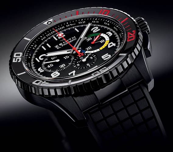 The new Zenith watch has been inspired by the brand’s Rainbow Flyback watch born in 1997. The 1997 high-performance timepiece was created according to technical specifications established for the French Air Force – to withstand the most extreme conditions.