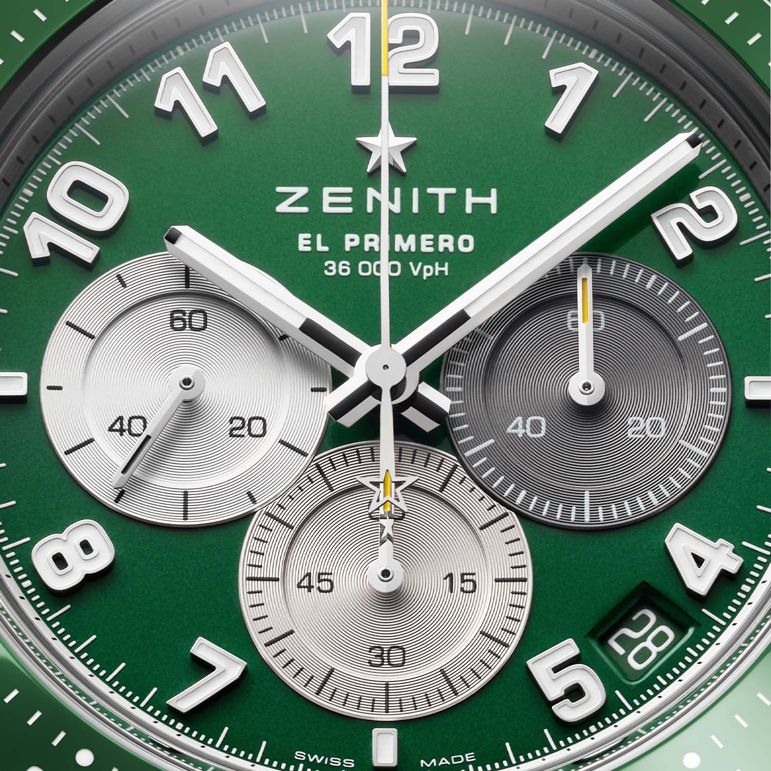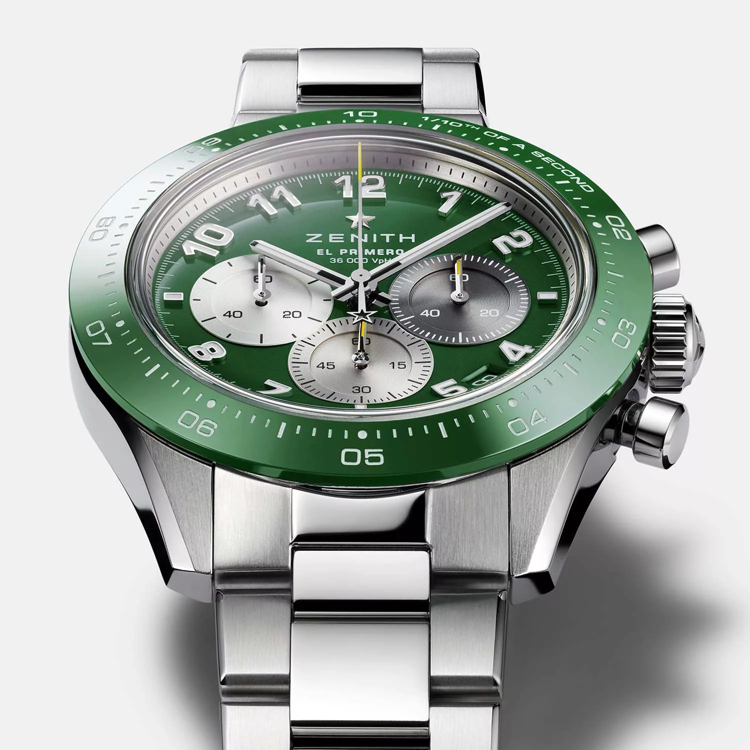The watch’s dial is also green and is lacquered with a sunburst finish. The dial features applied and luminescent Arabic numerals inspired by the numbers used on the jerseys of New York Jets players. The three overlapping sub-dials are picked out in shades of anthracite, light gray and silver and feature snailed interiors. The hour and minute hands are also luminescent, and the central chronograph seconds hand features a yellow tip and the signature Zenith star counterweight completing a full turn around the dial in 10 seconds – six times faster than a standard chronograph hand.